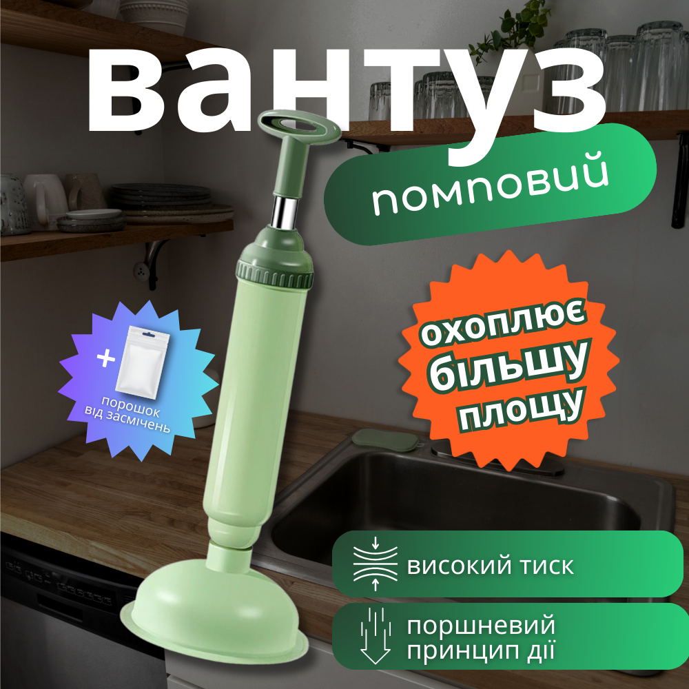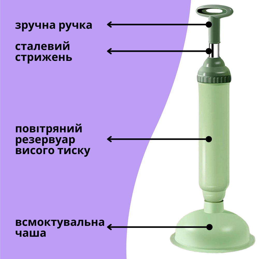 Цей універсальний пневматичний прилад забезпечить догляд за туалетними трубами, без пошкодження їхньої поверхні. Він легко миється і залишає слідів. Насадка не втрачає форму, а ручка виготовлена із високоякісного пластику з металевим стрижнем. Використання цього предмета може уникнути необхідності ремонту туалету.